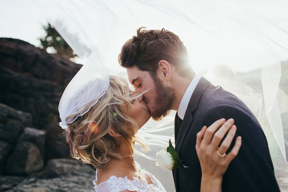 ↑ Megan & Jacob's sunset wedding photography at Boulder Beach, near Lennox Head |