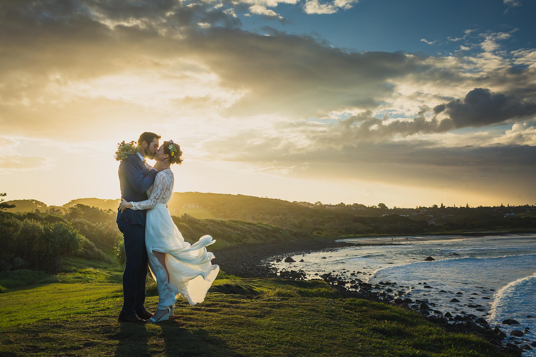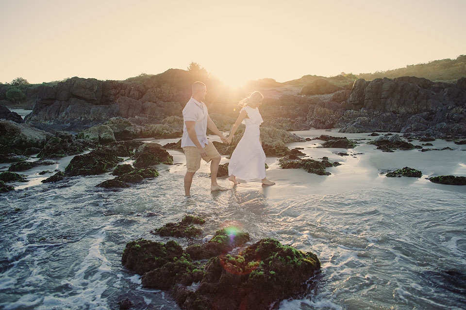 ↑ Megan & Jacob's sunset wedding photography at Boulder Beach, near Lennox Head |
